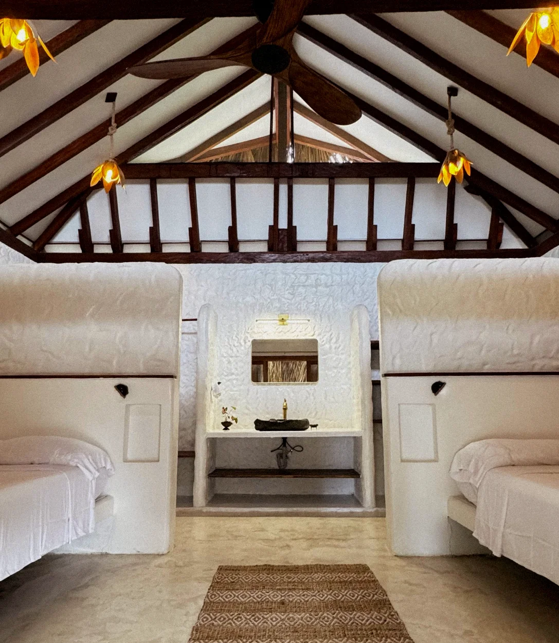 Wake to the sound of waves in your palm-thatched bungalow, a serene hideaway just steps from the ocean. Hand-troweled white walls, open-beam ceilings, and soft lotus-shaped lights create an airy, sunlit space. Your bamboo-frame bed features a breathable bamboo-cotton mattress, organic pillows, and silky sheets — all crafted from natural fibers for cool, restorative sleep.